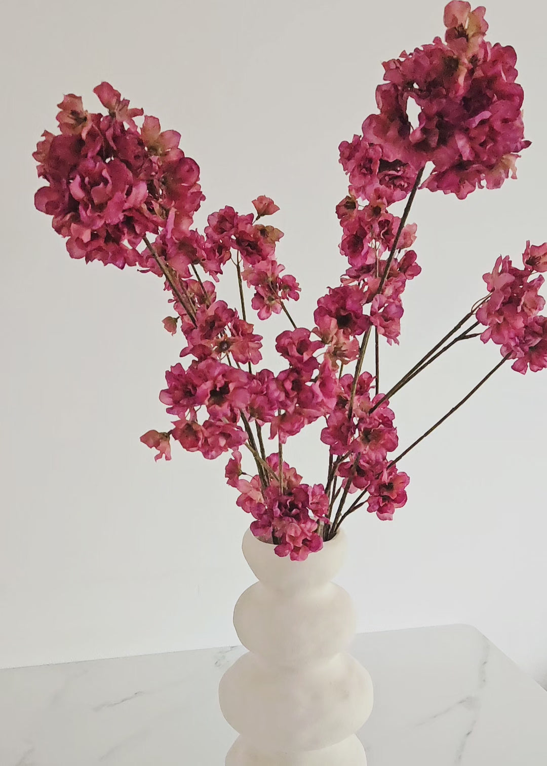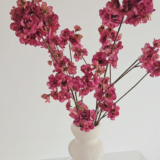 Bos met lange bloesemtakken in de kleur burgundy. Deze supermooie kleur is de kleur deze herfst en de winter die je terugziet in kleding, woonaccessoires en bloemen. De prunusbloesem heeft een donkerrode / bordeauxrode / donkerpaarse / fuchsiaroze kleur. De bloemen van de takken zijn van heel mooi zijden. Deze takken zijn echt een prachtige toevoeging aan jouw woondecor.